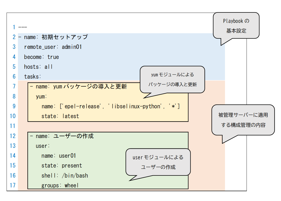 構成内容を記述する部分はさらに実行するモジュールごとに別れ、上記の例ではyumモジュールに関する設定が7~11行目に、userモジュールに関する設定が13~16行目に記述されている。