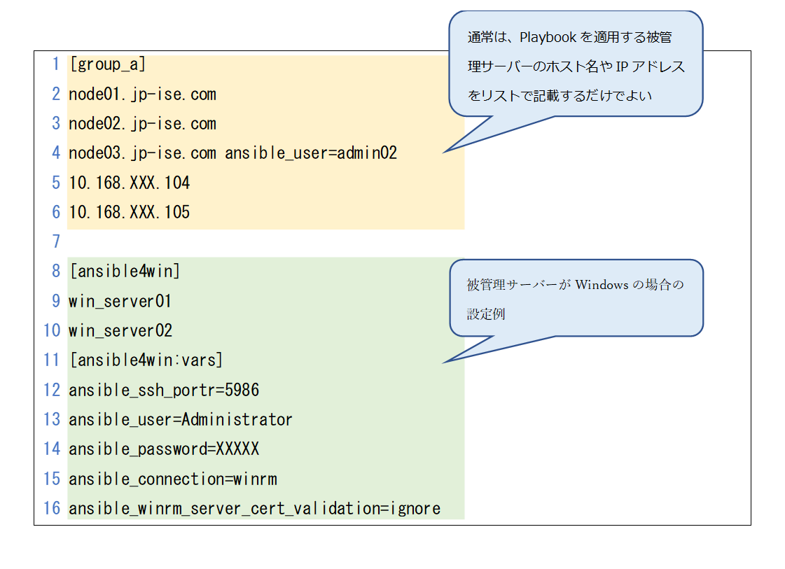 一方、Inventoryファイルは被管理サーバーの接続情報を定義するテキストファイルで、主に被管理サーバーのホスト名やIPアドレスのリストを記載するほか、被管理サーバーにアクセスする際に使用するユーザーID、パスワードやSSH鍵、被管理サーバーに導入されているPythonのパス、といった情報を記載することもある。