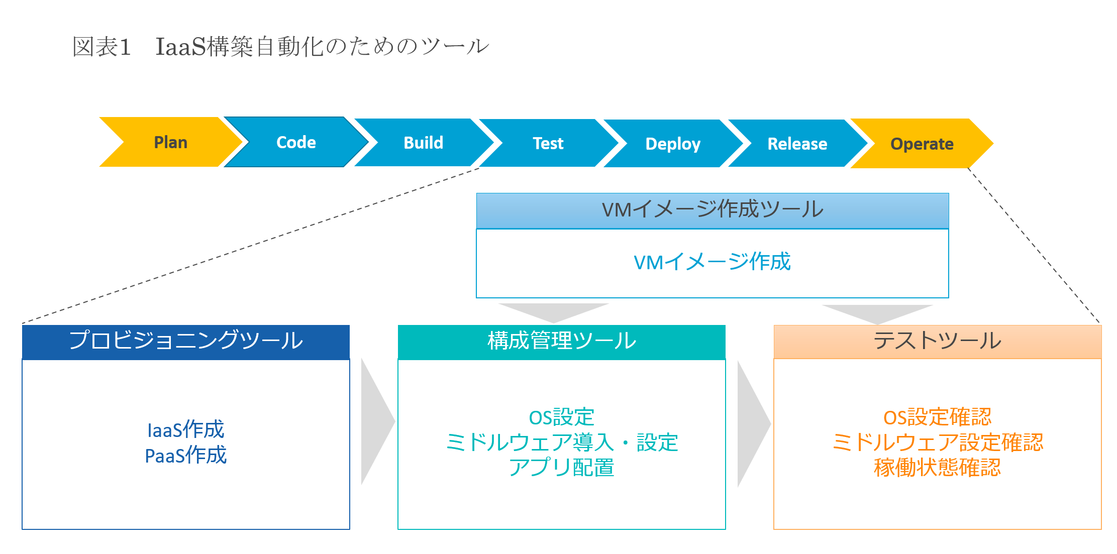 IaaS構築時の自動化ツールは、大きく4つに分類できる。アプリケーションのライフサイクルに当てはめると、主に「Test」~「Operate」のフェーズで使用される(図表1)。