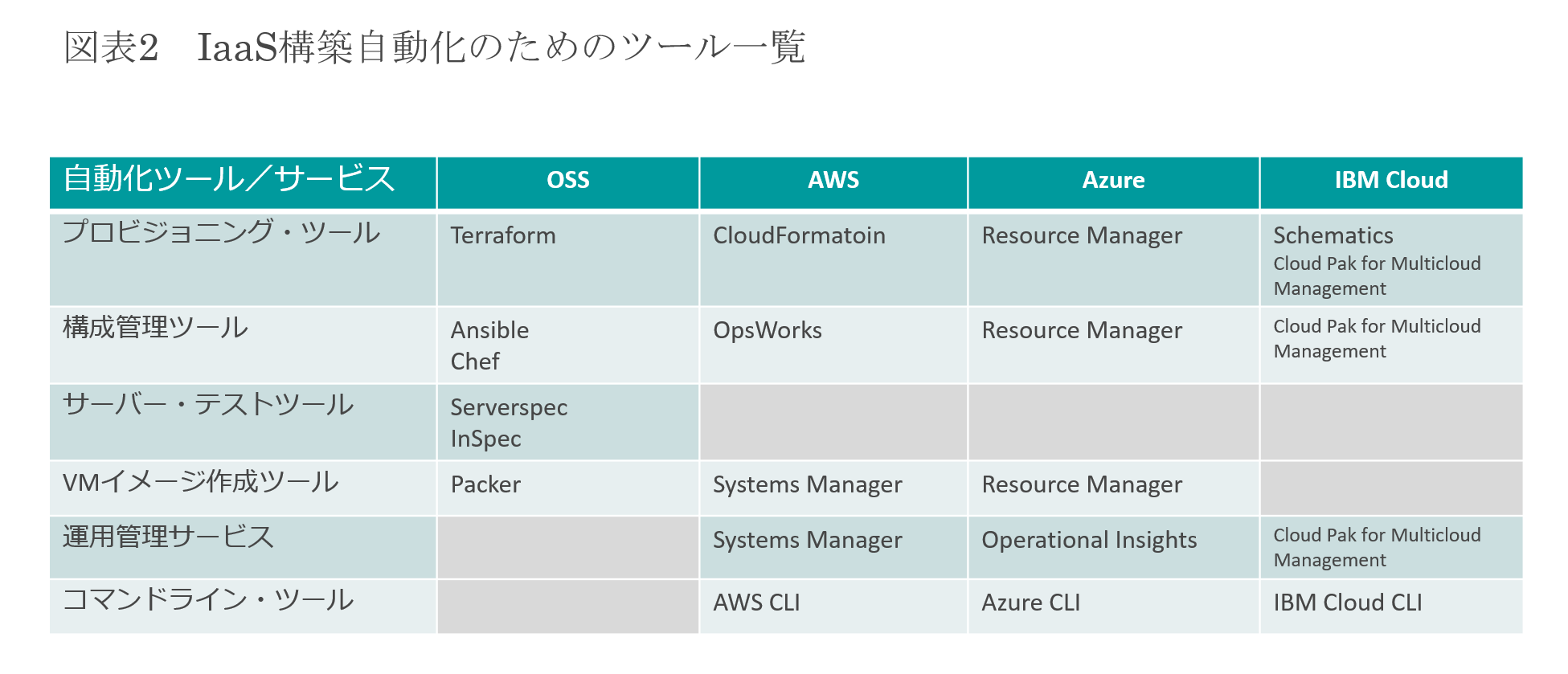 各クラウドプロバイダーから、自社クラウドのさまざまな運用タスクを自動化するサービスが提供されている。自社のさまざまなサービス、AnsibleやInSpecなどのツールと組み合わせが容易で、運用タスクごとの自動化処理を記述したテンプレートも用意されている。