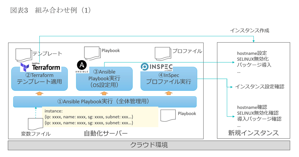 Terraformでクラウド上にLinuxインスタンスを作成し、Ansibleで同インスタンスに対しhostname設定などのOS設定を行ったうえで、InSpecでインタンスの設定(インスタンスタイプやセグメント等)とOS設定が正しいかを確認している。