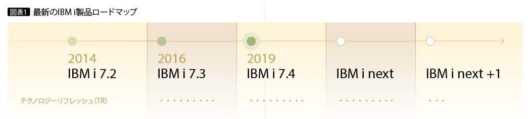 IBM i製品ロードマップは、最新のリリースから2つ先のメジャーリリースの提供を示しており、将来にわたる継続的な技術革新への取り組みを示すものである。今回のIBM i 7.4のリリースにより、製品ロードマップはIBM i 7.4から2つ先のメジャーリリースを示すように更新された(図表1)