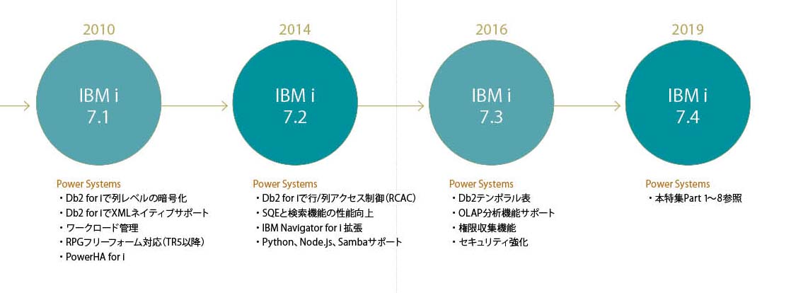 これまでのメジャーリリースにおける拡張を振り返ると、2010年にリリースされたIBM i 7.1では、Db2 for iに列レベルの暗号化が提供され、列内の値を暗号化して保存できるようになった。