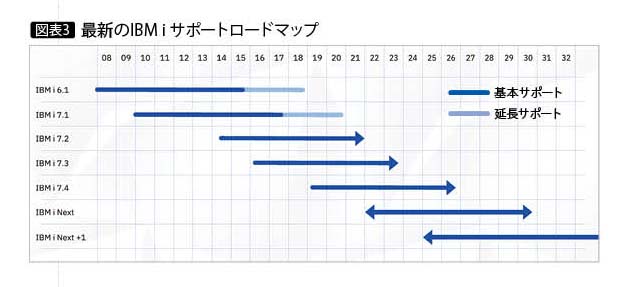 IBM iサポートロードマップは、これまでのIBM iリリースのサポート期間およびサポート予定と、将来の2リリースについてのサポート予定を示したものである。IBM i 7.4の発表により、現行リリースがIBM i 7.4に更新されたサポートロードマップが提供された(図表3)