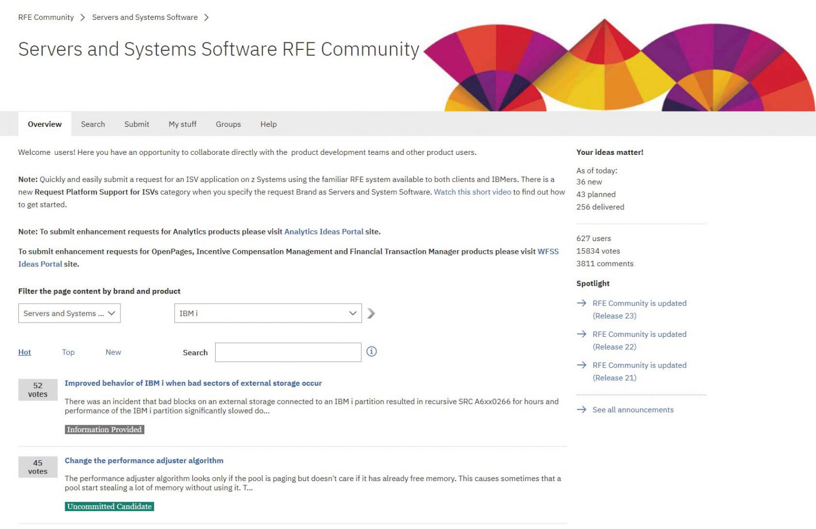 RFE(Request For Enhancement)とは、IBM製品全般について機能拡張・改善要望を受け付けるサイトである。サイトに登録されたユーザーからの開発要望はだれでも閲覧でき(IBM developerWorksのID登録が必要)、気に入った要望に投票可能である。登録された要望は、Submitted → Under Consideration → Deliveredと、検討ステージが確認できる。