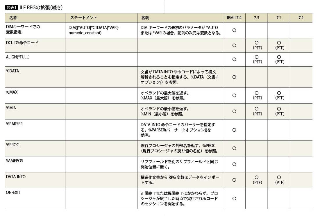 ILE COBOLは、IBM i 7.3でも、プロシージャに渡すパラメータ数を返すための組み込み関数PARMSの追加や、プロシージャ呼び出しの最大パラメータ数を400から16,382へとする拡張、Unicodeや多国語対応を意識した拡張などを行ったが、IBM i 7.4においても、SETADDRESS OF…ステートメントを動的に実行するのに似たALLOCATEステートメントの追加、FILLERデータ項目をINITIALIZEステートメントで初期設定できるようにする拡張、ユーザー指定の順序でテーブル・エレメントを整列させるテーブルSORTステートメントなどの拡張を行った(図表2)。
