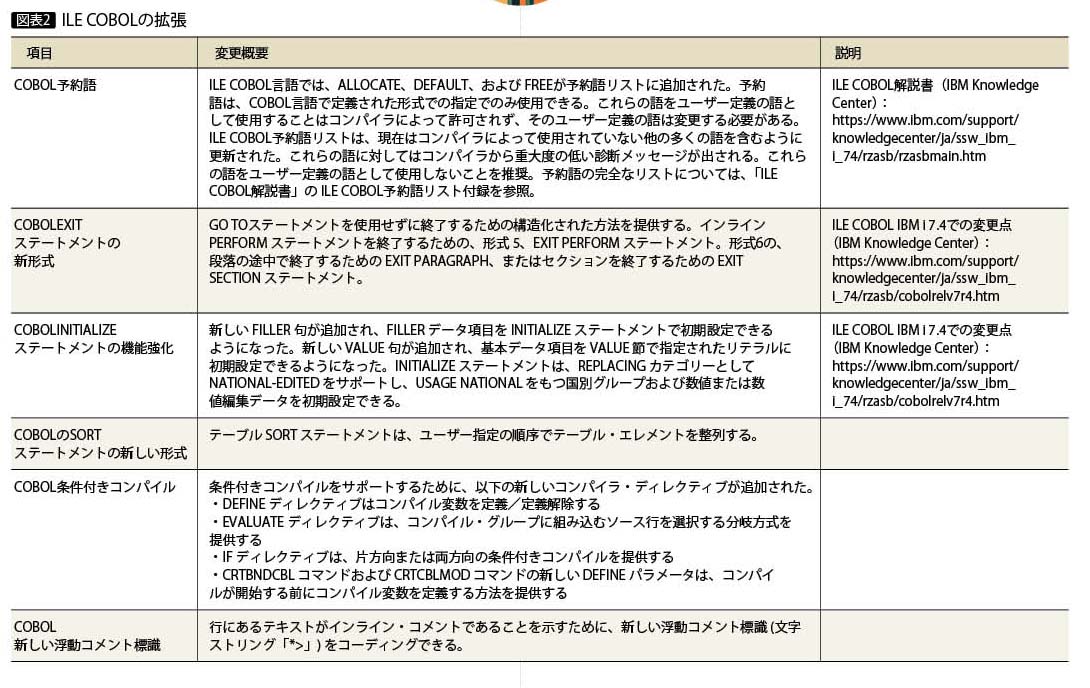 ほかにも新しい予約語の追加、GO TOステートメントを廃した構造化プログラミングステートメントを実現するための拡張、インラインコメントの追加など、オープン系言語を意識したコーディングしやすさの向上が図られている。詳細は図表2やIBM Knowledge Center の「ILE COBOL解説書」を参照してほしい。