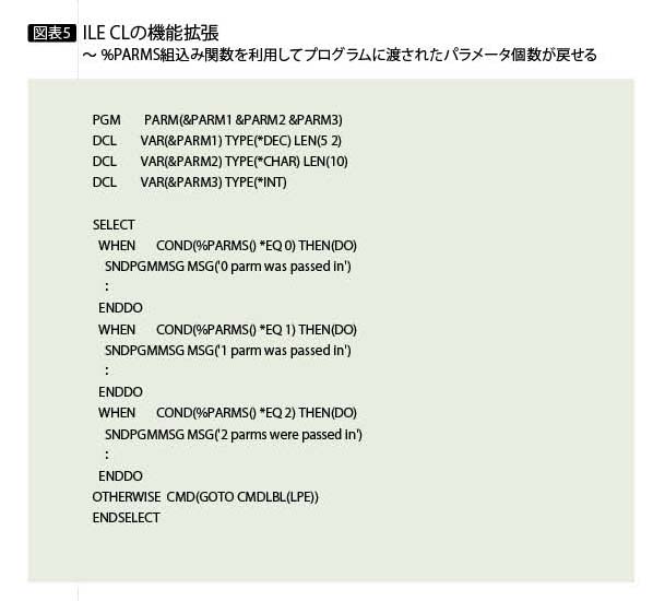 また、ILE CLでは図表5のように%PARMS組み込み関数を利用してプログラムに渡されたパラメータ個数を戻せるように拡張された。