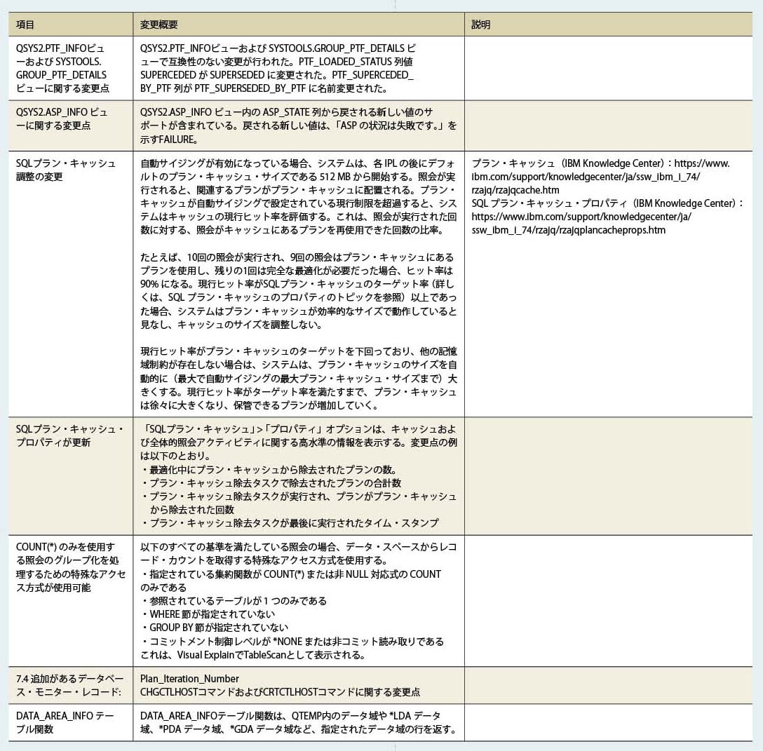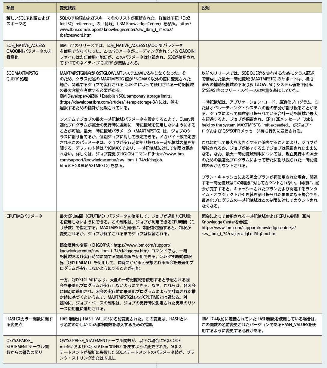 ・IBM i 7.3以前でSQLの動作を制御できたQAQQINIファイルは、IBM i 7.4では参照されなくなった(QAQQINIファイル自体は使用可能だがシステムから参照されない)