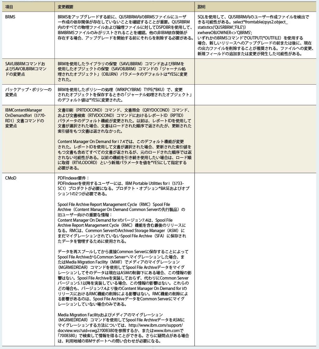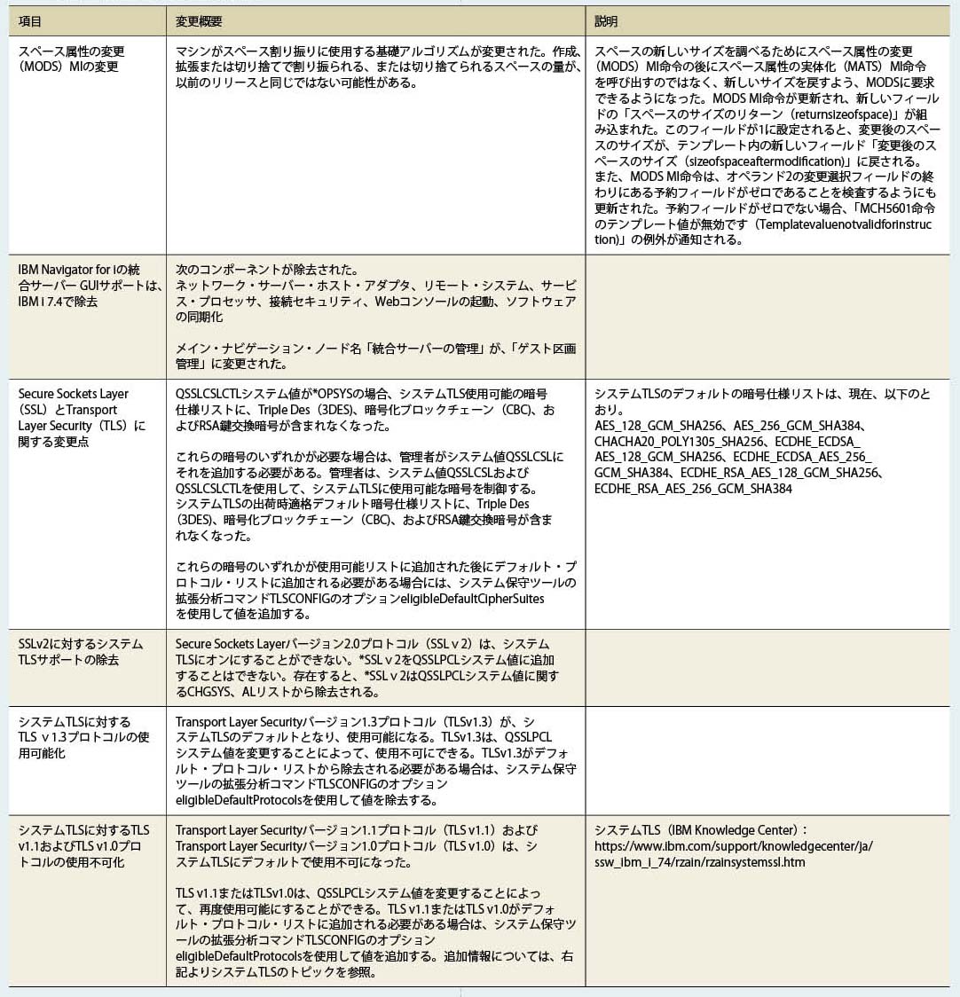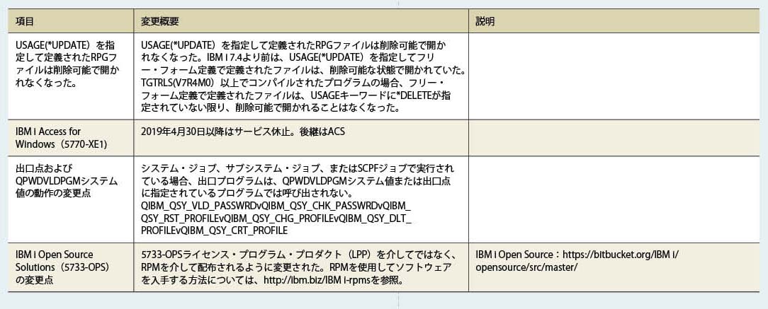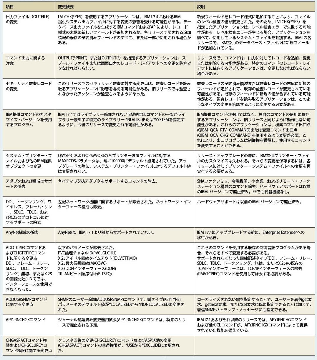 また、IBM i 7.4のOS提供コマンド類でOUTPT(*PRINT)およびOUTPUT(*)の出力結果が以前のバージョンと異なる場合があるため、バージョンアップを検討するユーザーは注意していただきたい。詳細はIBM Knowledge Centerで確認が必要である。