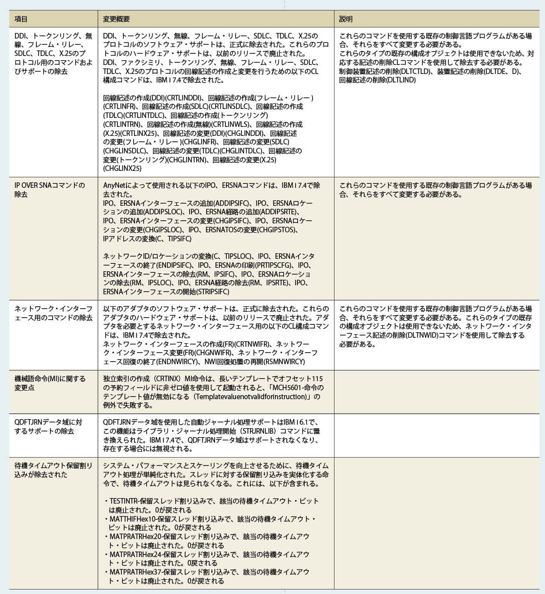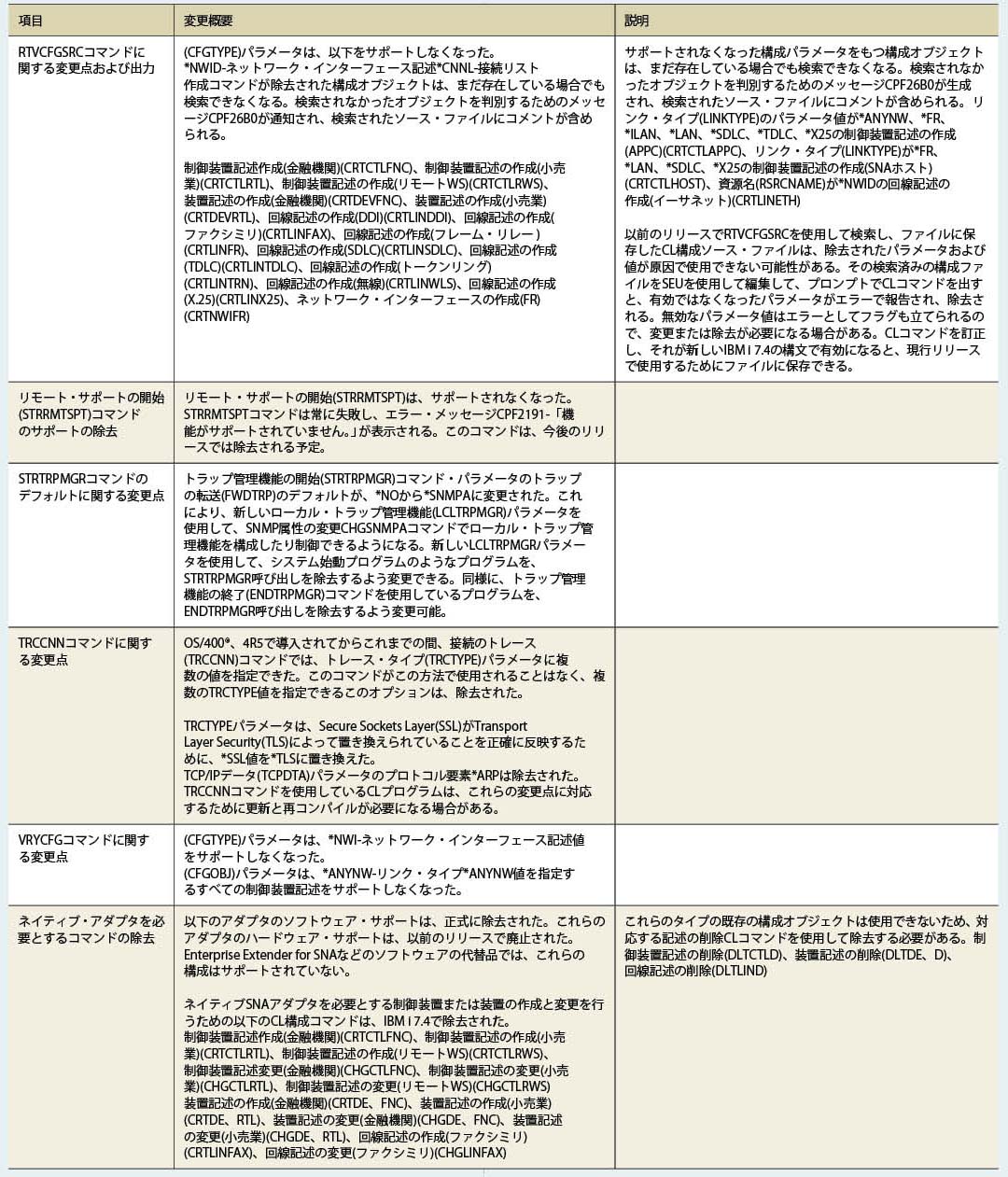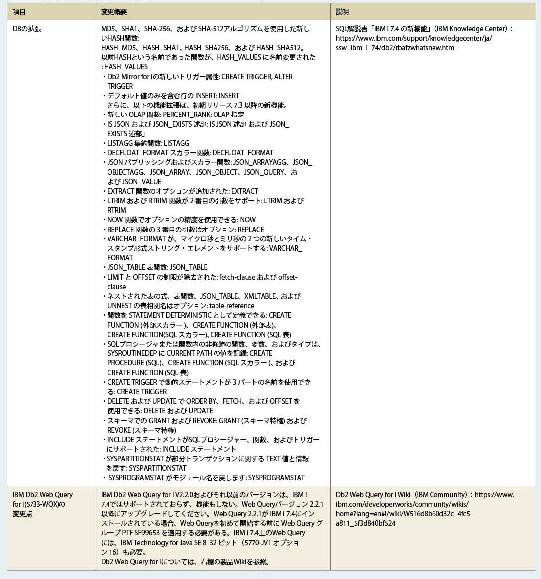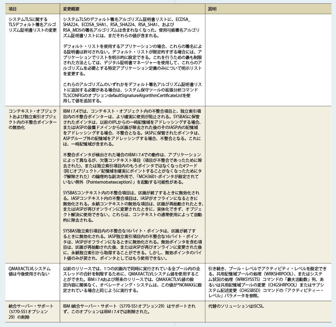 また、IBM i 7.4のOS提供コマンド類でOUTPT(*PRINT)およびOUTPUT(*)の出力結果が以前のバージョンと異なる場合があるため、バージョンアップを検討するユーザーは注意していただきたい。詳細はIBM Knowledge Centerで確認が必要である。