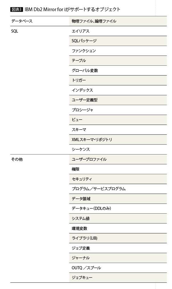 IBM Db2 Mirror for iではRPGやCOBOLによるレコード・レベル・アクセスやSQLアクセスがサポートされ、物理ファイルや論理ファイル、テーブルやビューのいずれもサポートされる。また、データベース・オブジェクト以外にもプログラムやユーザープロファイル、システム値なども同期対象オブジェクトとなっている(図表3)。