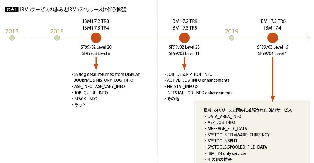 IBM iサービスは、2013年にPTF情報を表示するDSPPTFコマンドに変わるQSYS2.PTF_INFOが提供されて以来、拡張を続けてい る(図表1)。5250画面でログインしなくても、システム状況を把握できるサービスである。