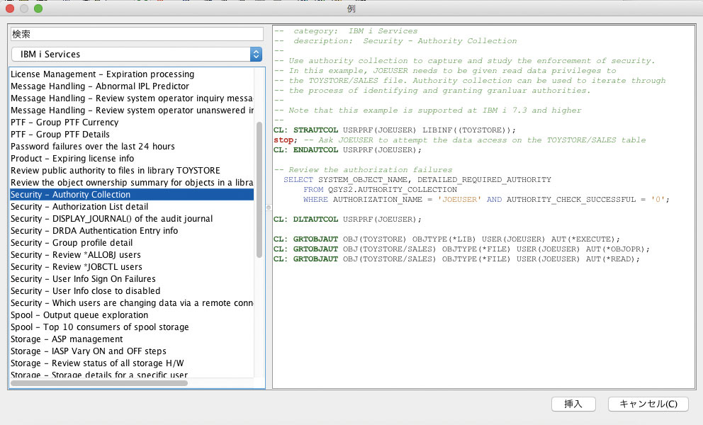 IBM i 7.4で拡張された権限収集機能を使って収集したデータにもSQLでアクセス可能となっている。最新バージョンのIBM i Access Client Solutionsの「SQLスクリプトの実行」画面では、IBM i サービスのSQLスクリプトのサンプルが用意されているため、ぜひ活用してみてほしい(図表2)。