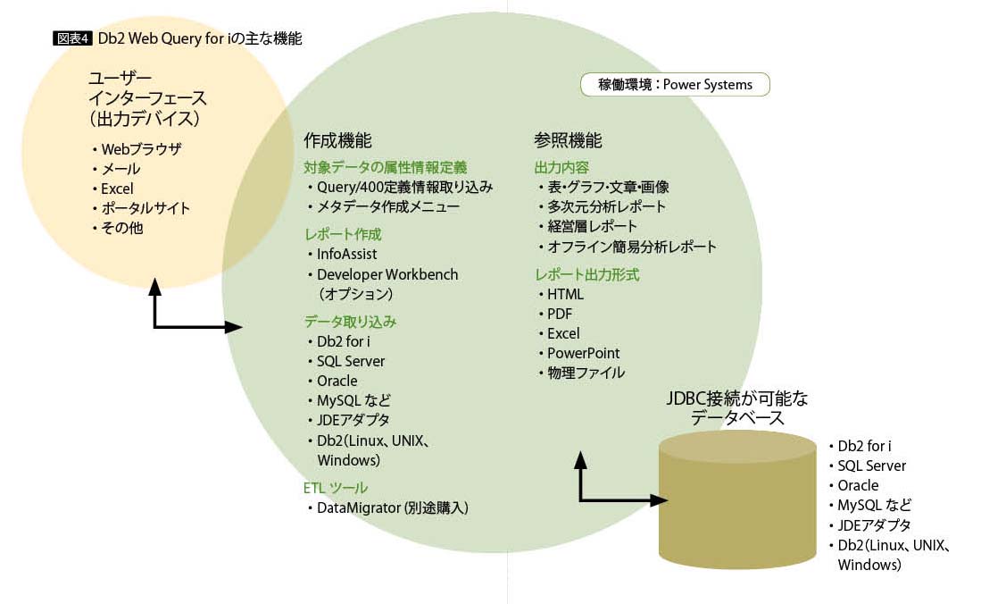 Db2 Web Query for iは、IBM i上で稼働し、WebブラウザからリアルタイムにDb2 for iや他データベースのデータを照会・ 分析できるデータ活用ツールである(図表4)。Db2 Web Query for iはIBM i OSとは別に独自でバージョンをもっており、最新バージョンは2.2.1である。
