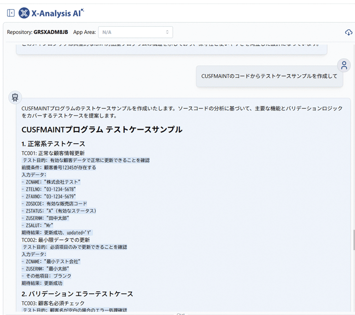 どちらもX-Analysis Advisorではサポートされていなかった新しい機能である。ソースコードの説明は、「仕様の概要レベル」「ソースコードのブロック単位の説明」「ソースコードの1行レベルの説明」などバリエーションがあり、これらを出力した後に応用的なプロンプトを投げることで、テストケース作成のほか、さまざまな生成AIとの会話を通した結果を得られる。また従来からのX-Analysis Advisorの機能も、もちろん会話形式で並行して利用できる。