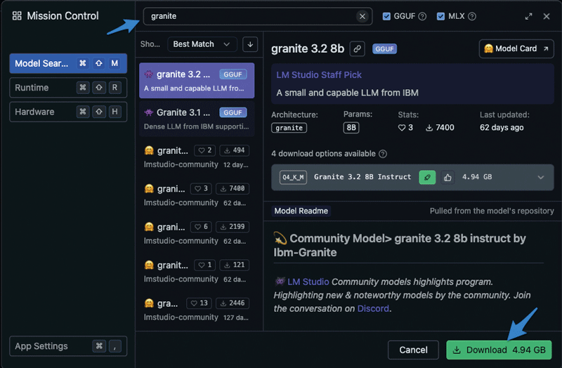 LM Studioを起動したら、オープンで利用可能なLLMを選択してインストールしよう。本当にたくさんのLLMがあるが、今回はIBM granite 3.2 8bをダウンロードして使用する。左側の虫眼鏡アイコンをクリックすると、LLMを検索してダウンロードできる画面が表示される(図表23、図表24)。