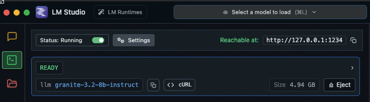 検索窓にgraniteと入力し、表示されるgranite 3.2 8bをクリックして右下のダウンロード・ボタンをクリックすると、ダウンロード・ウインドウが表示される。マシンのスペックにもよるが、ダウンロードは数分で完了するはずだ。終わったらダウンロード・ウインドウを閉じ、右下に表示されているLoad Modelボタンをクリックして、ここでLLMをロードしておく。ロードが完了すると、LM Studioの上部にモデル名granite-3.2-8b-instructが表示される(図表25)。