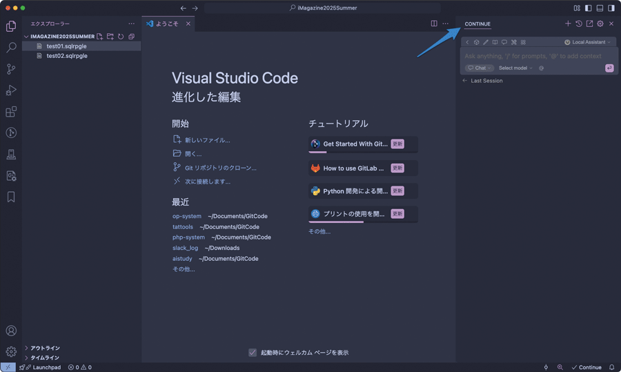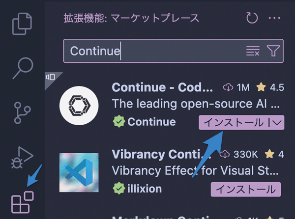 ローカルでgranite 3.2 8bを稼働できたので、続いてVSCodeからこのLLMにアクセスする準備をしよう。使用する拡張機能はContinueだ。今回はローカルで稼働しているLLMにアクセスする用途でContinueを使うが、アクセスはAPI経由なので、IP通信できればLLMがどこで稼働していようが構わない。
