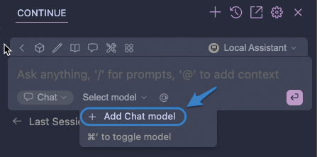 次に、先ほどローカルで起動したLLMサーバーをContinueが参照するように設定する。まず、チャットのプロンプト入力ウインドウの下の「Select model」をクリックし、「+ Add Chat model」をクリックする(図表31)。