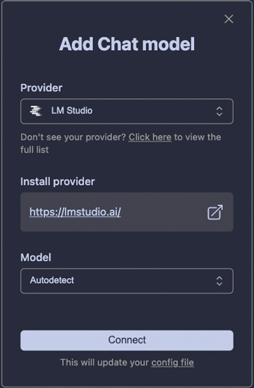 続いて表示される「Add Chat model」のProviderでLM Studioを選択する(2025年4月29日現在、Providerをクリックしても選択可能なリストが直後に表示されないので、キーボードでLMなどと打鍵して選択する必要がある。図表32)。