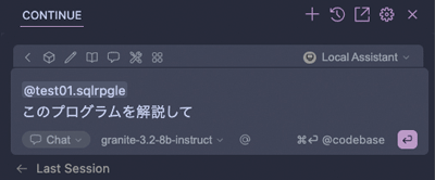 では、先ほどGitHub Copilotに作成させたプログラムtest01.sqlrpgleの解説をgranite に依頼してみよう。GitHub Copilotと異なり、対象ソースコードをVSCodeで開いても、それをプロンプト内に自動的に含めることはデフォルトでは行われない。GitHub Copilotとはこの点が異なるので注意しよう。