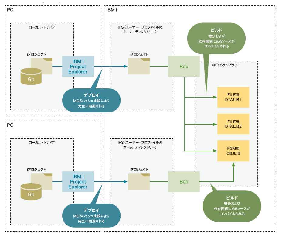 これは、RDiのiプロジェクト機能を発展させたものと言えるが、大きく異なるのは、ソース物理ファイルを全く必要とせず、DDSやRPG IIIを含むすべてのソースをテキスト・ファイルで管理できる点と、コンパイル先ライブラリーを複数指定できる点である。これを実現しているのがBobである(どのように実現しているかは後述する)。