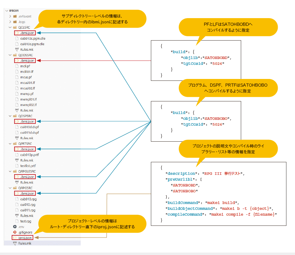 図表21は、筆者が検証に使用したiプロジェクト内のツリー構造である。コンパイル先ライブラリーなどの情報は、プロジェクト・レベルであればiproj.json内、サブディレクトリー・レベルであればibmi.json内に記述する。