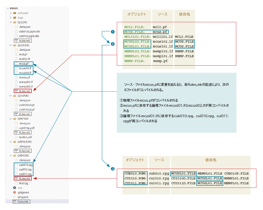 プロジェクト内のディレクトリー単位に、Rules.mkファイルにオブジェクトの依存関係を記述しておくことで、たとえば物理ファイルのレイアウトを修正した際に、従属する論理ファイルとそれらを参照するプログラムが自動的にコンパイルされる。図表22はその例である。