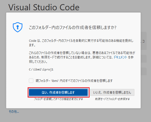 ❸ フォルダーの作成者を信頼するか尋ねられるので、「はい、作成者を信頼します」をクリックする。