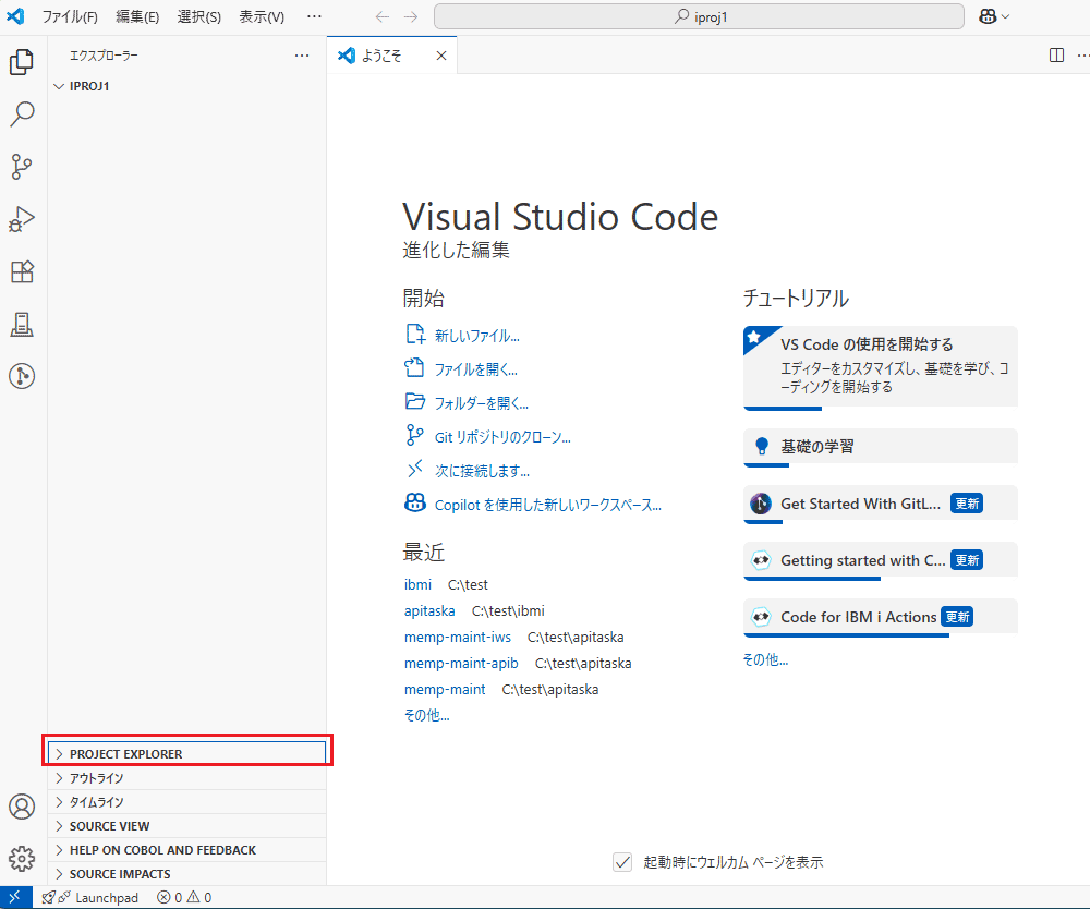 ❼ フォルダーiproj1がIBM iプロジェクトとして認識され、右側に説明文が表示されるようになる。