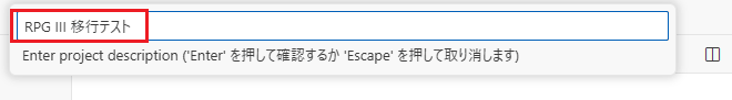 ❻ プロジェクトの説明文の入力を求められるので、任意のテキストを入力する。ここでは例として、「RPG III 移行テスト」と入力する。
