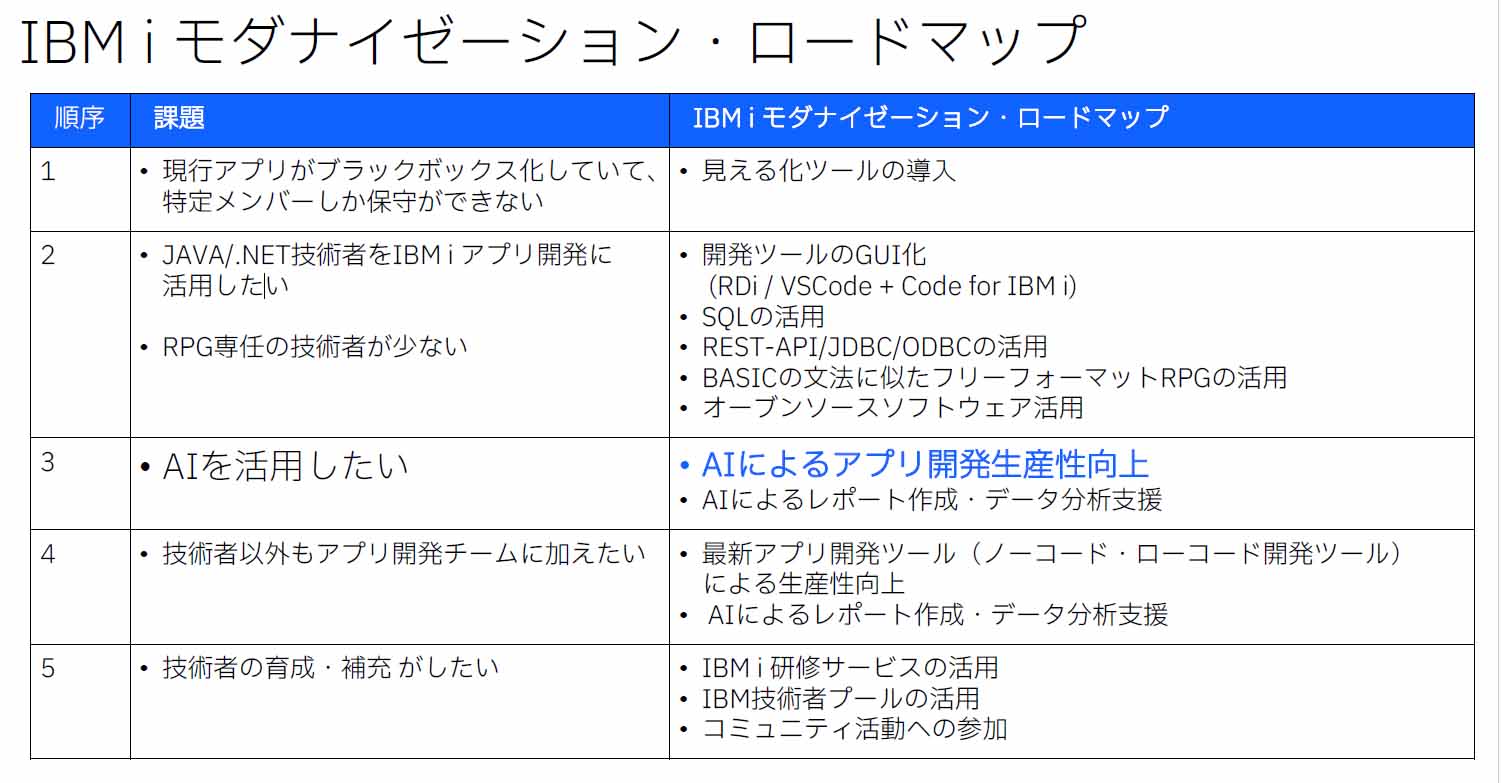 そして原氏は、IBM iを使い続けていくためのさまざまな課題に対しては「ソリューションでお応えできる体制をとっています」として、次の「IBM i モダナイゼーション・ロードマップ」を説明した。