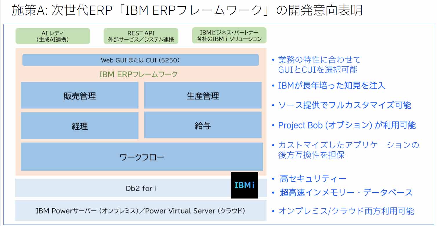 施策AはERPパッケージで、どのパッケージを使ったらよいか判断が難しいというお客様向けに、IBMが現在開発しています。ソースコードもご提供しますので、IBM iのお客様自身で、もしくはSIer様と協業してカスタマイズすることが可能です。