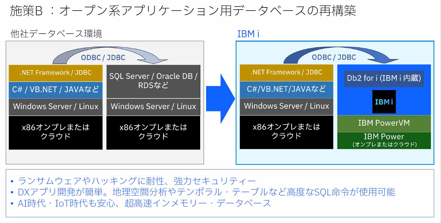 2つ目の施策Bは、オープン系データベースの維持・メンテナンスと機能に課題を持っておられるお客様向けに新たに設けた、IBM iへのデータベース移行と再構築のご提案です。