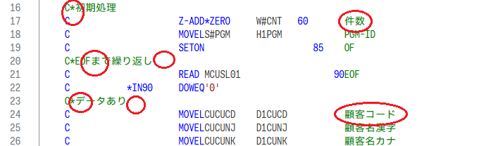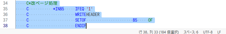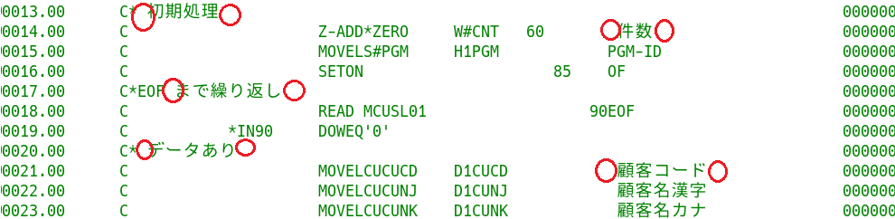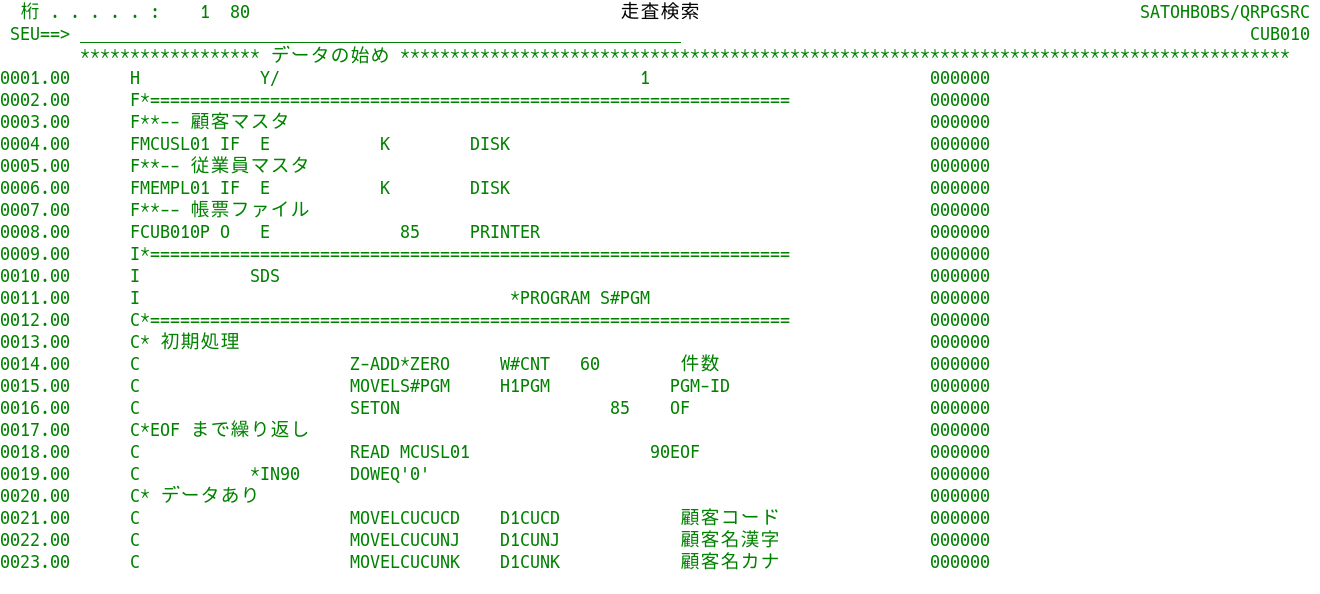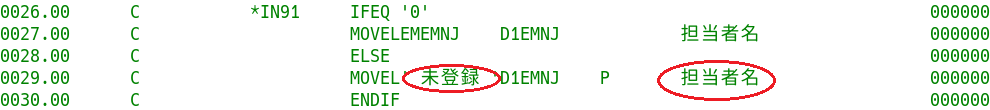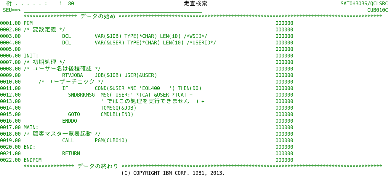 これもRPGソースと同様の変換が行われている。CLプログラムのソースは、記入桁の制限がないフリーフォーマットなので、シフト文字削除による桁ずれの影響は軽微と思われる。