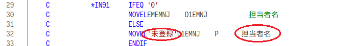 コメントに含まれるシフト文字が削除されるのは問題とならないが、次のように仕様書の記入欄に全角文字が含まれている場合、正常(コンパイル可能)であるにもかかわらず桁ずれが起きて文法エラーのように見えるため、編集する際は注意が必要である。