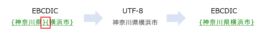 また、ユニコードへの変換時に削除されたシフト文字は通常、EBCDICへの変換時に再び挿入されるが、次のように連続したシフト文字({と}で表している)は変換の過程で完全に削除されるため、この点も注意が必要である。