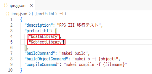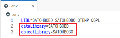 今回は、設定ファイル内のデータベース・ファイルのコンパイル先ライブラリーを&dataLibrary、それ以外のオブジェクトのコンパイル先ライブラリーを&objectLibraryという環境変数に置き換える。