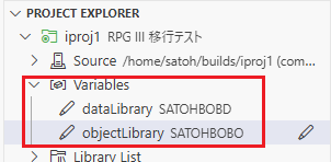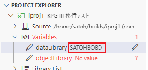 現在のプロジェクト内の設定ファイルには、データベース・ファイルのコンパイル先ライブラリーとして”SATOHBOBD”、それ以外のオブジェクトのコンパイル先ライブラリーとして”SATOHBOBO”が直接記述されている。