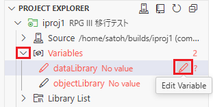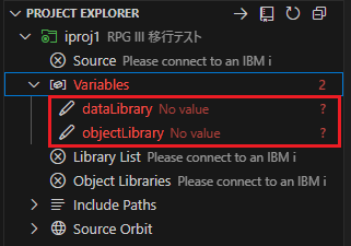 その後、Project Explorerを確認すると、「Variables」見出しの色が赤に変わり、その右側に2という数字が表示されている。これは、未解決の変数が2つあることを示している。