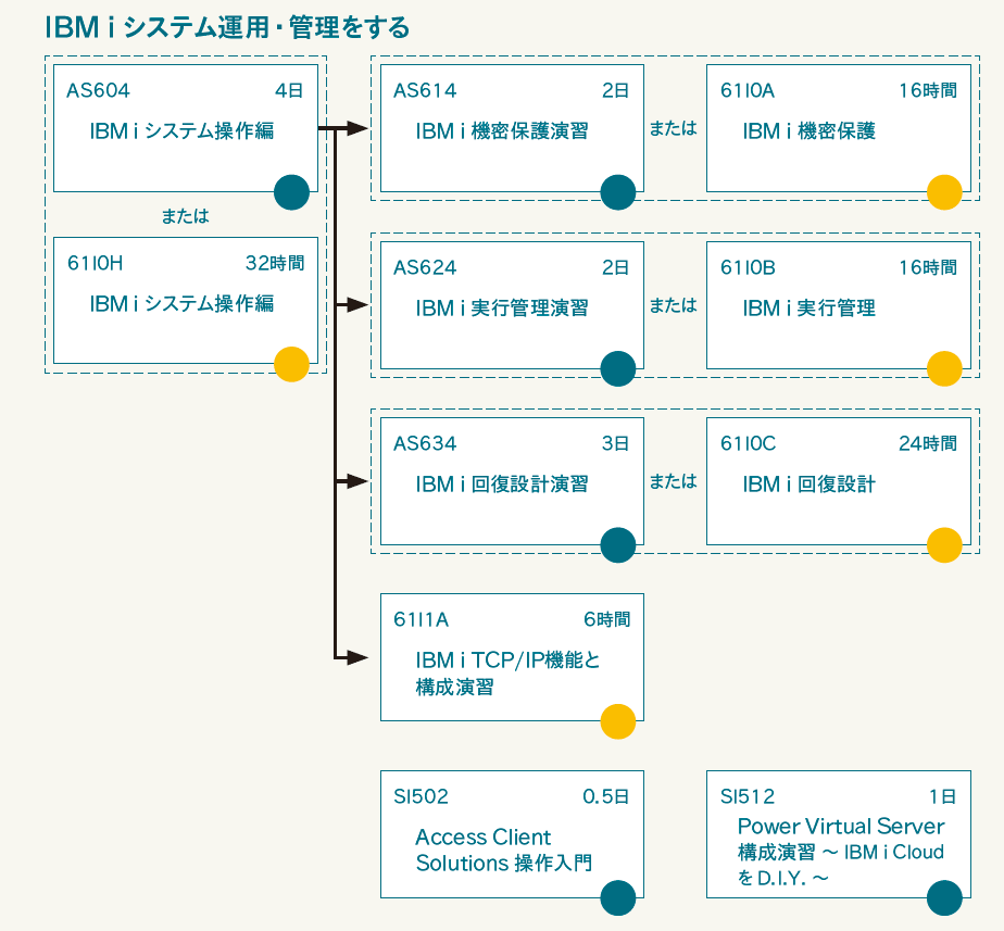 アイ・ラーニングのIBM i関連の研修は、現在34のコースで構成されている。IBM i入門、システム操作、運用管理、セキュリティ、ネットワーク、Power Virtual Ser
