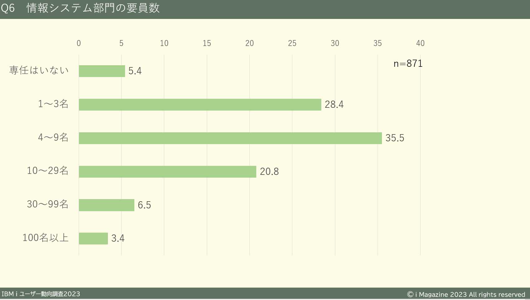 今回は871件の回答を得た。回答者の年代は最多が「50代」で46.2%、システム経験年数の最多は「30年以上」で33.7%という結果だった。50代以上は全体の61.9%、システム経験20年以上は全体の61.2%ということになる。前回もほぼ同様の結果で、「IBM iユーザー動向調査」はベテラン層の回答が多い調査と言える。