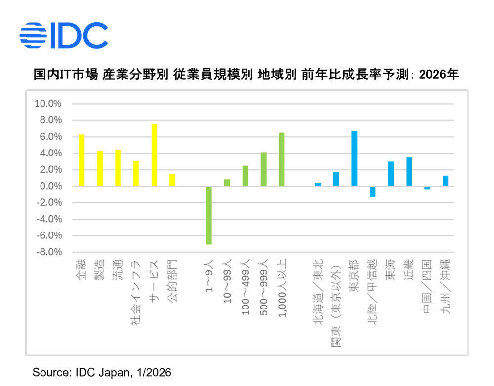 なお、大都市圏(関東地方、東海地方、近畿地方)の中でも、東京都、近畿地方で2026年も堅調にIT支出拡大を予測しているが、関東地方(東京都を除く)、東海地方では、地域に生産拠点を置く大手自動車会社などで米国関税政策の影響によってIT支出が見直されていることから、地域全体でのIT支出もプラス成長ながら比較的小幅の成長率に留まると見ている。