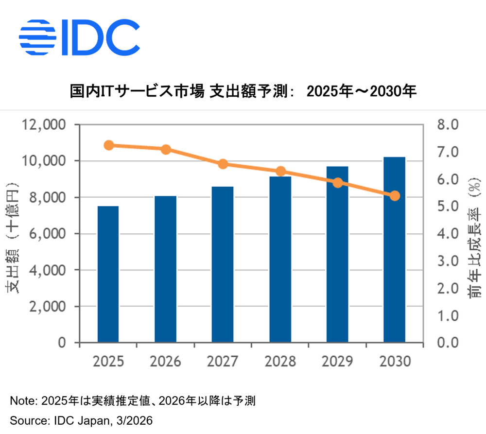 2025年の国内ITサービス市場は、既存システムのITモダナイゼーションに向けた支出が市場を牽引したほか、データ・AI(Artificial Intelligence)活用に向けた環境整備に関連する支出の拡大も見られ、前年比7.3%増となる7兆5663億円となった。