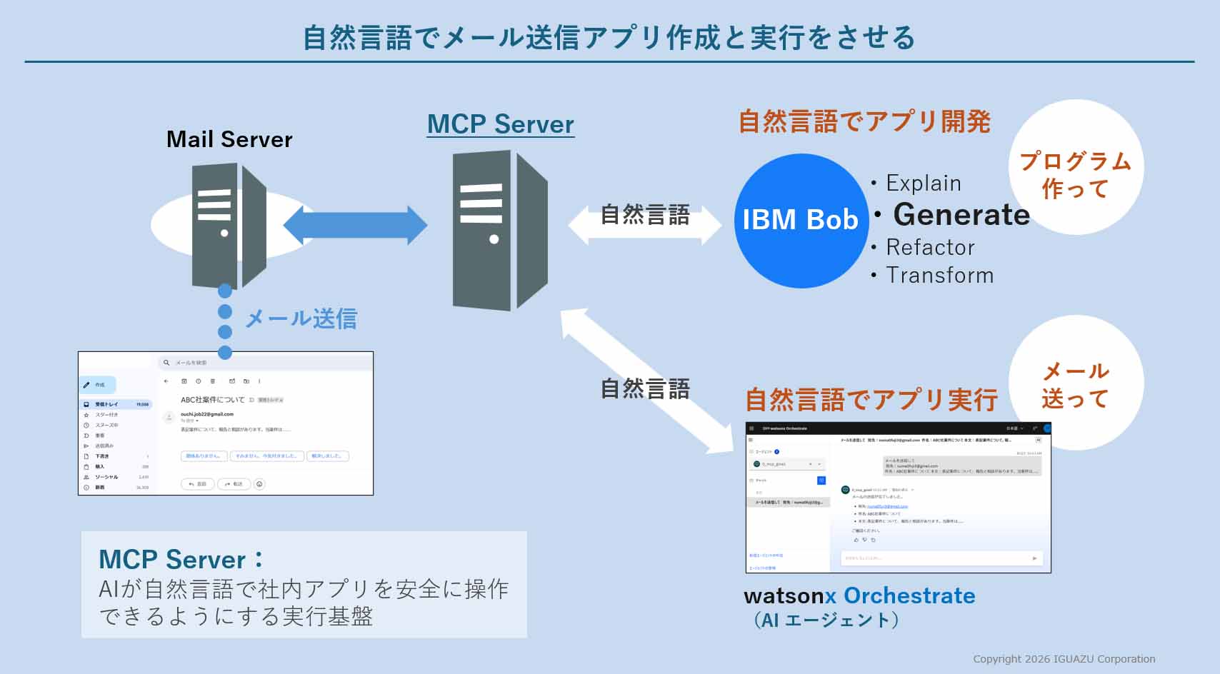 RPGでは、プログラムの解説、コード生成、他言語への変換の効率性と正確性の検証。Pythonでは、IBM BobによるMCPサーバー・アプリケーションの新規開発(仕様書生成、コード生成、テストケース生成・実行)と、IBM watsonx Orchestrate(AIエージェント製品)からのメール送受信の指示を、開発したアプリケーションが正しく実行するかの検証である。