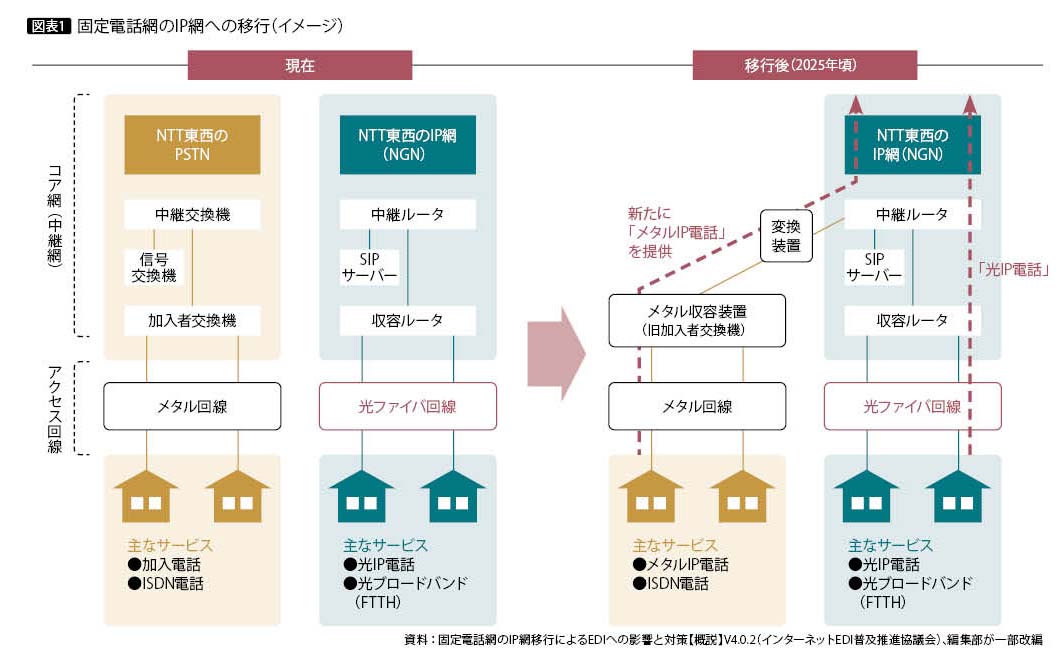 このなかの「中継交換機」が2025年ごろに“寿命”を迎えるために固定電話網(PSTN)のサービスが終了し、2024年以降は図表1右側の「移行後」の形態となる。