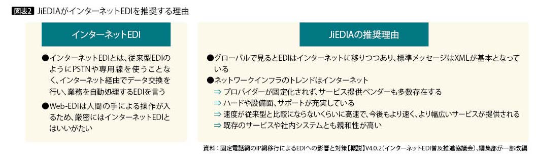 JiEDIAでは従来型EDIの代替策として、インターネットEDIを推奨している。「グローバルで見るとEDIはインターネットに移りつつあり、標準メッセージはXMLが基本となっている」(仲矢氏)のがその理由で、インターネットベースであれば、既存のサービスや社内システムとも親和性が高く、ネットワーク・スピード、プロバイダー/ベンダー、設備面などで多くのメリットを得られるからである(図表2)。