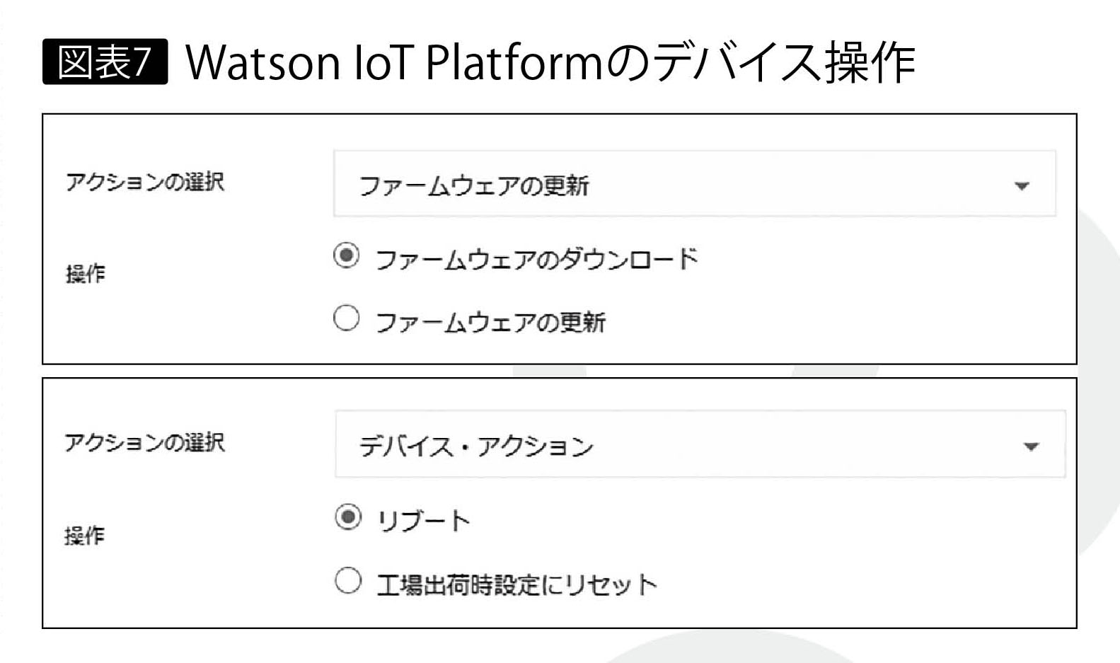 Client Library内に実際のアクション・コードを実装すれば、IBM Cloudコンソールから図表7のようにリブートやリセット、ファームウェア更新などのアクションを実行できる。ただしデバイス操作は、万一不正アクセスなどの被害が生じた際の損害リスクが高いため、充分なアクセス制御を実施し、実行者の多要素・多段認証などを組み合わせて保護する必要がある。