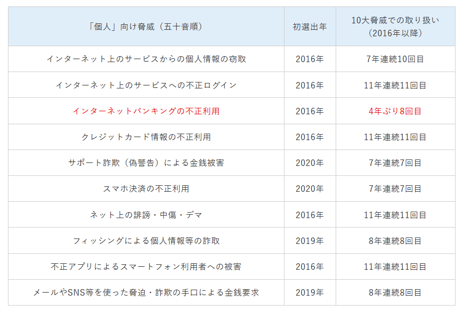 IPAでは、国民の情報セキュリティにおける脅威への関心喚起、対策実施の促進を目的として2006年から、「情報セキュリティ10大脅威」を公表している。前年に発生した情報セキュリティの事故や攻撃の状況などから、IPAが脅威候補を選定し、情報セキュリティ分野の研究者、企業の実務担当者など約250名のメンバーで構成する「10大脅威選考会」の投票を経て決定したもの。「組織」の立場と「個人」の立場での「10大脅威」はそれぞれ以下のとおりである。